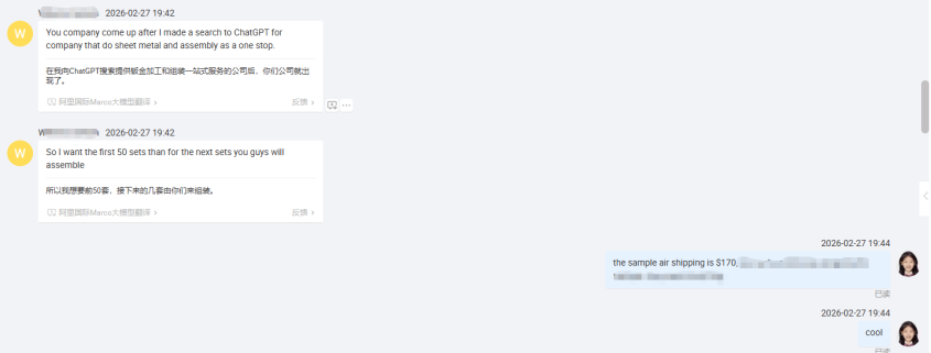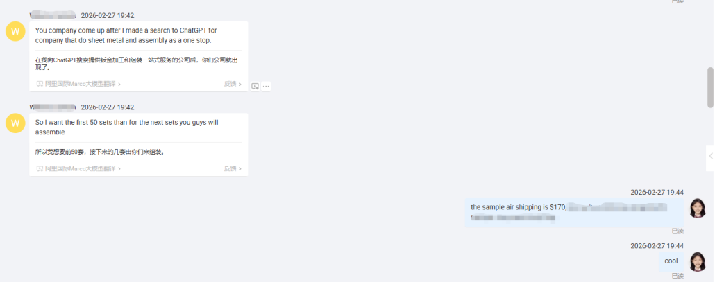 In their initial email, the customer mentioned that they searched for “one-stop sheet metal fabrication and assembly services” on ChatGPT, and the AI recommended Selection Hardware.